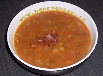 Eliminate dalla zuppa le foglie di salvia e il peperoncino. Distibuite la zuppa nei piatti e disponete al centro di ciascuna la pancetta croccante, condite con un filo d'olio crudo e servite.